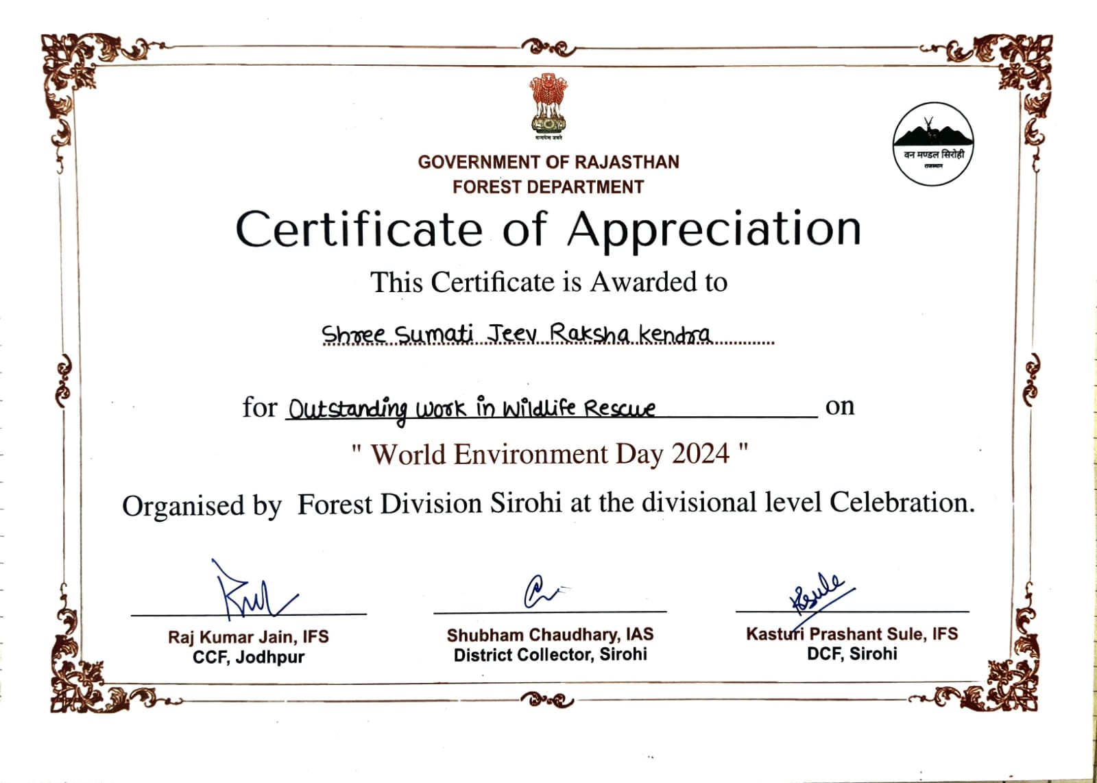 KP Sanghvi is honored to receive a Certificate of Appreciation from the Government of Rajasthan Forest Department, recognizing our continued commitment to wildlife conservation, animal welfare, and sustainable practices in India.